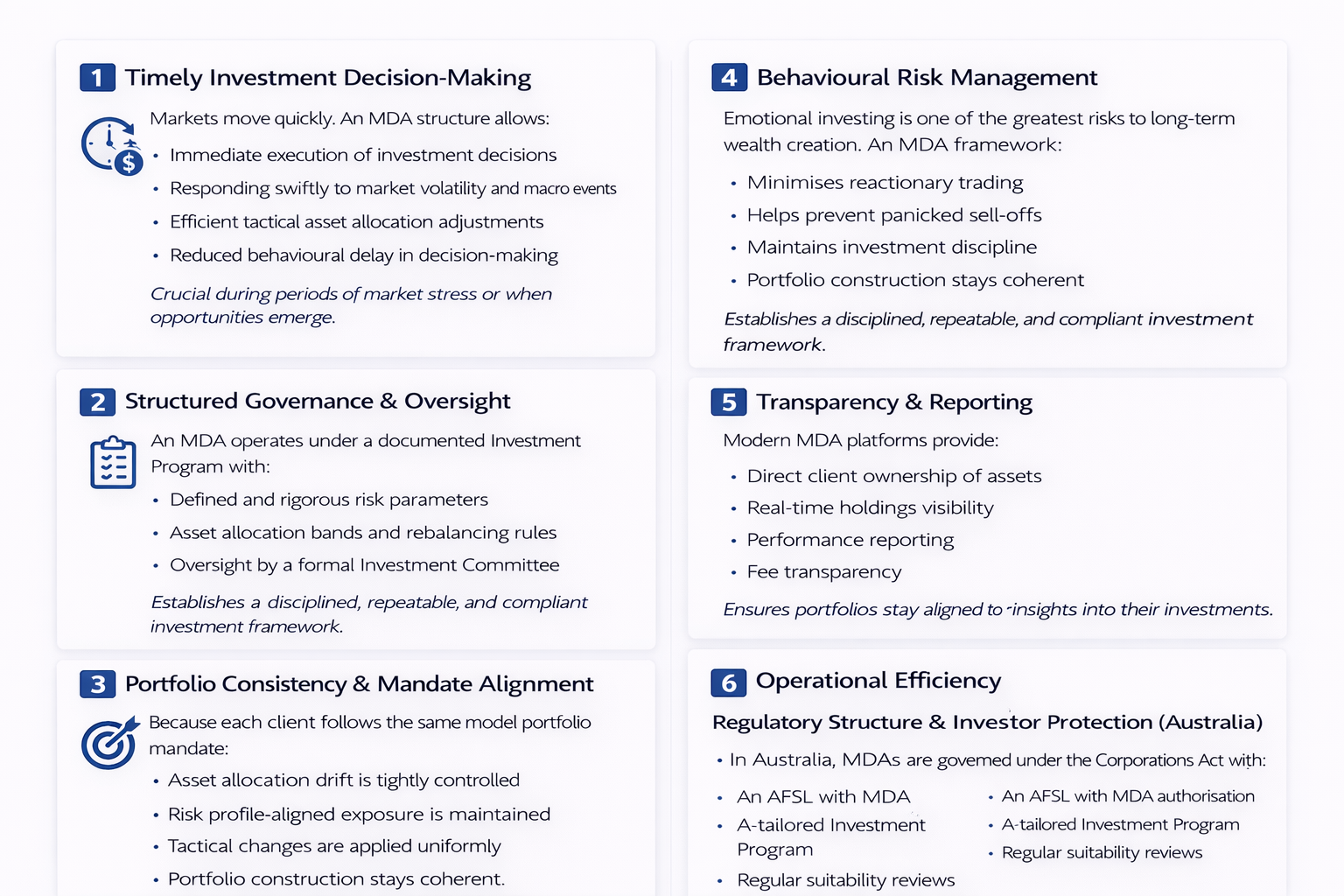 The Benefit of an MDA model portfolio allows an investment manager to make portfolio decisions on behalf of a client within an agreed mandate - wihtout requiring client approval for every transaction. Under an MDA arrangement, the portfolio operates within documented investment parameters, risk settings and asset allocation ranges.